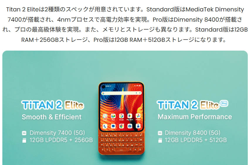 ▼Unihertz Titan 2 Eliteが搭載するSoCはDimensity 7400とDimensity 8400。ベースモデルがDimensity 7400で、上位グレードのProモデルがDimensity 8400となっています。↓