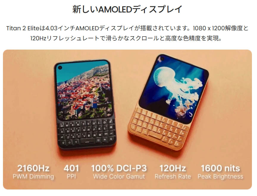 ▼Titan 2は4.5インチの液晶ディスプレイでしたが、Titan 2 Eliteは4.03インチの有機ELディスプレイを搭載。↓