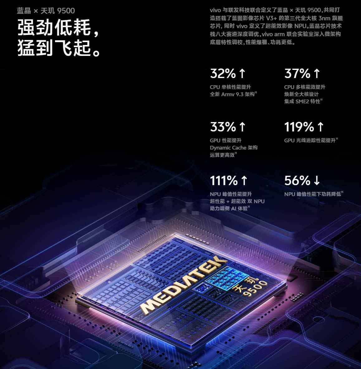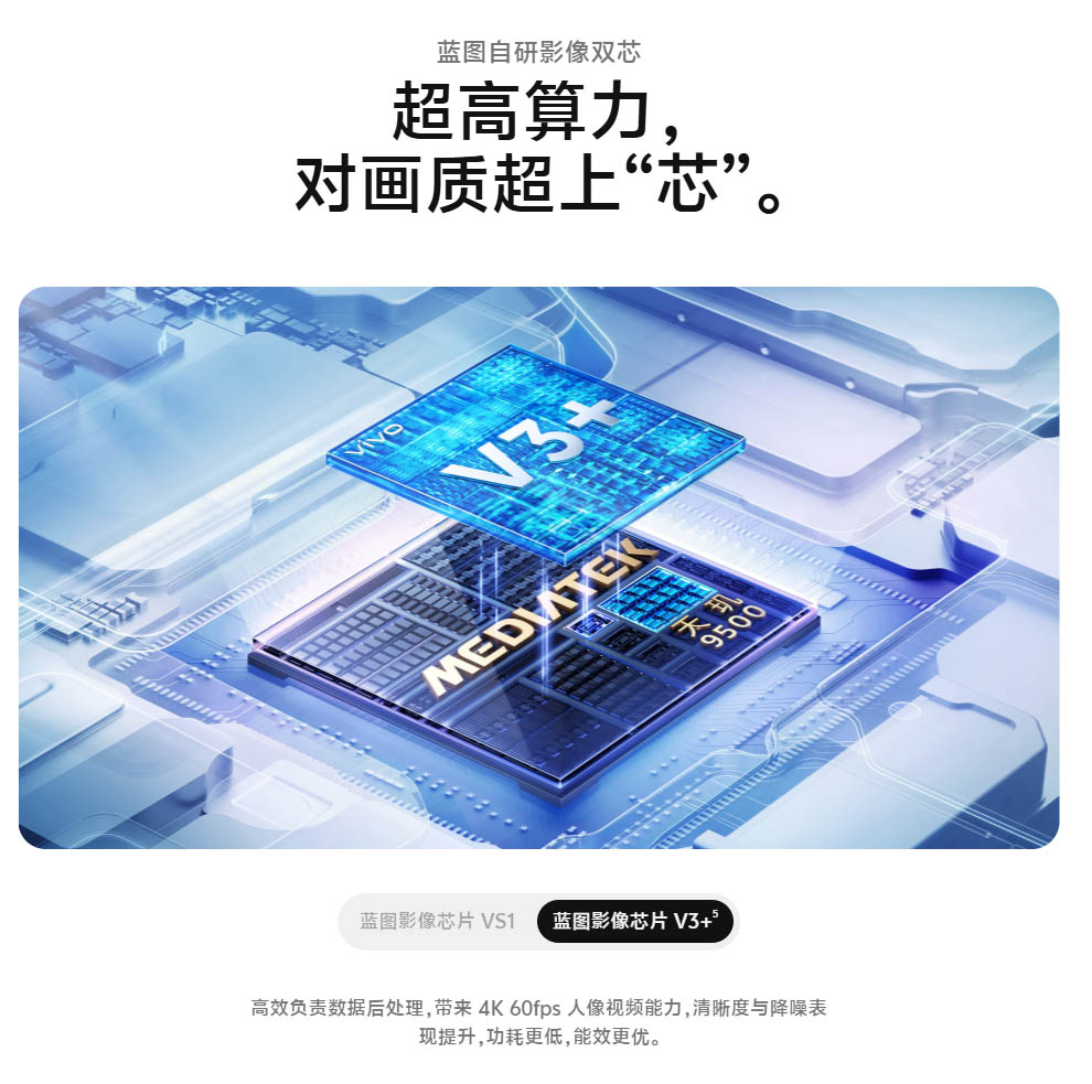 また、イメージングチップのVS1とV3+を搭載します。vivoのハイエンドスマホには自社開発のイメージングチップ(=カメラのAI画像処理を支援するチップ)が搭載されているんですが、今回はなんとSoCに組み込まれているらしい(もちろんvivo専用)。