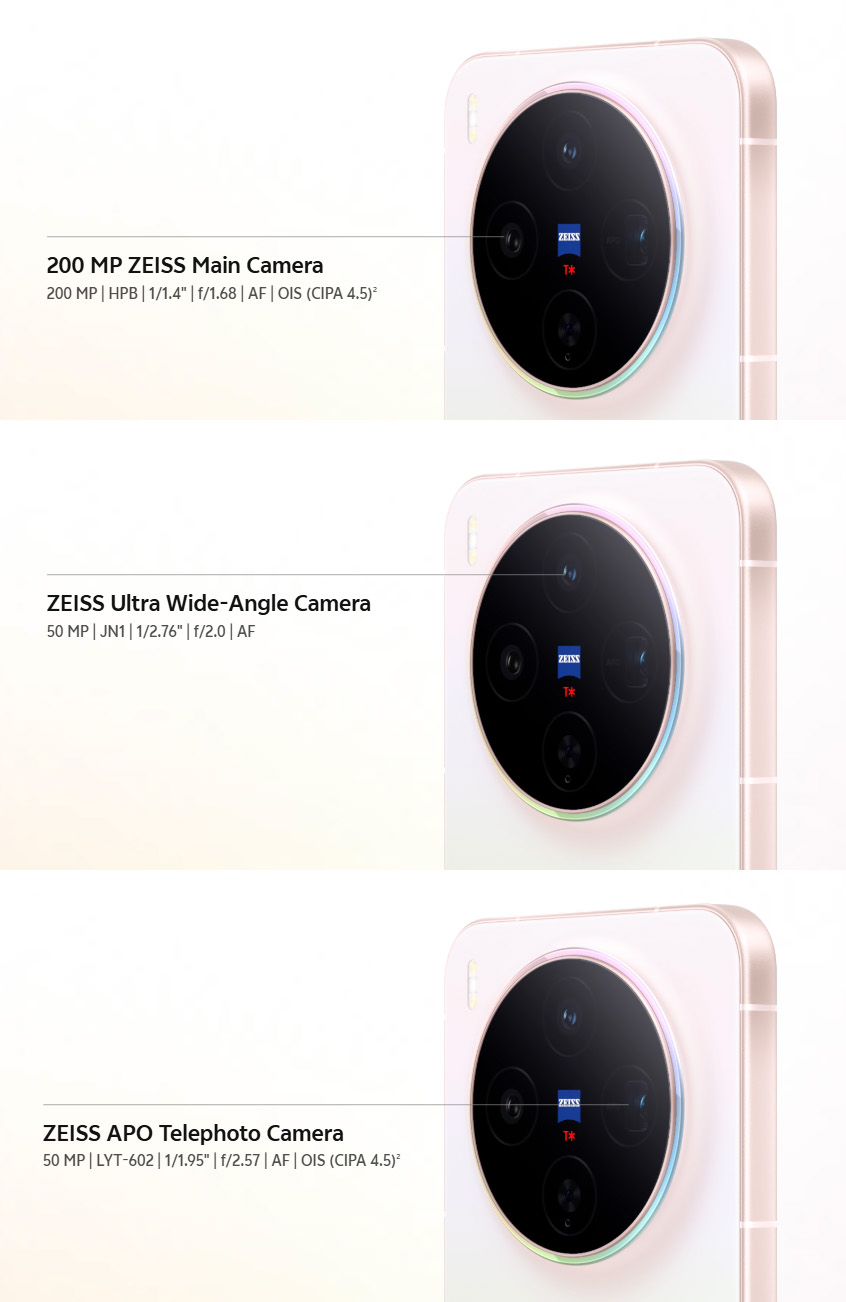 ▼リアカメラは200MP(広角、f/1.68)+50MP(超広角、f/2.0)+50MP(望遠、f/2.57)のトリプルカメラ構成。フロントカメラは50MP(f/2.0)です。このカメラはZEISSとの共同開発!↓