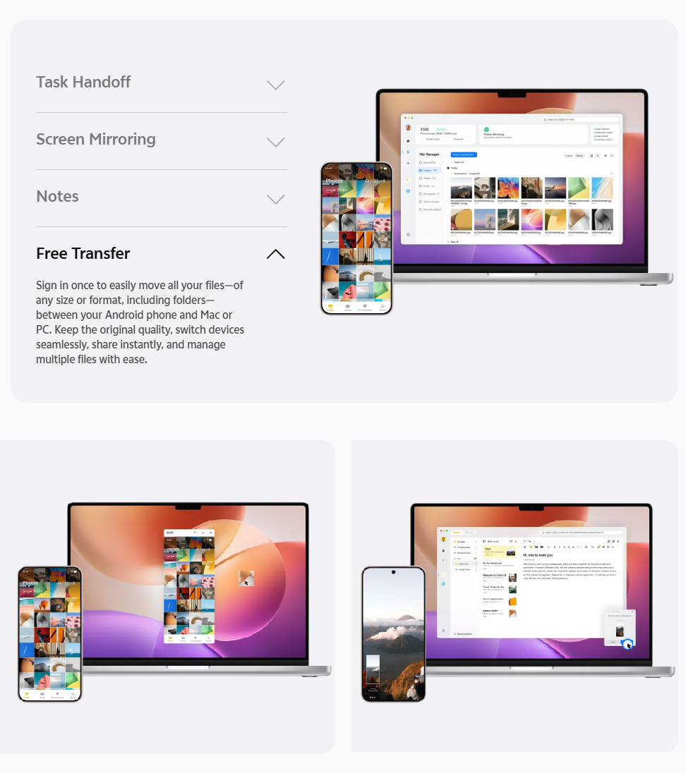 ▼WindowsやMacとの連携機能も強化。PCとスマホ間でファイルを共有したり、PCでスマホの通知を受信したり、スマホの画面をミラーリングしたりすることが可能です。↓