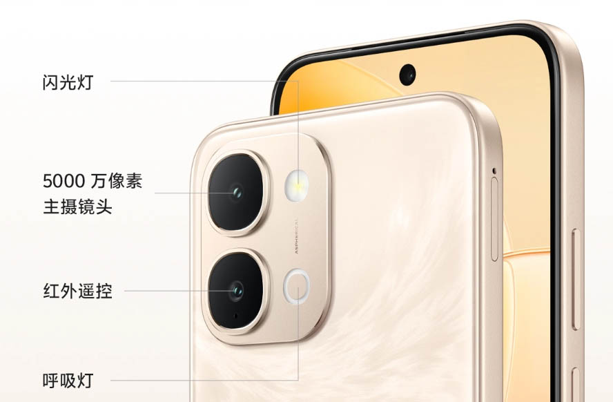 ▼カラーは凤迎金(ゴールド系)、曜石黑(ブラック系)、星河银(シルバー系)の3色。先代のY300iは円形カメラバンプでしたが、Y500iは長方形のコンパクトなデザインになっています。↓