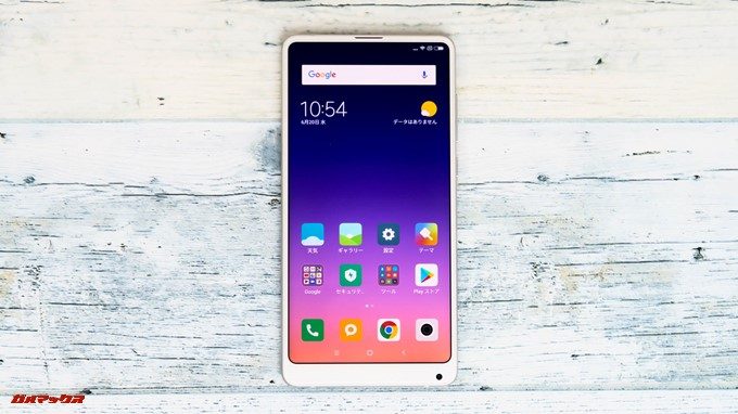 ▼Xiaomi Mi Mix 2Sは5.99型の超大画面を搭載。左右と上部のベゼルは薄いですが、画面周りは黒い縁が入っています。本体上部はギリギリまでベゼルが狭いのでインカメラは下部右側に搭載されていました。↓