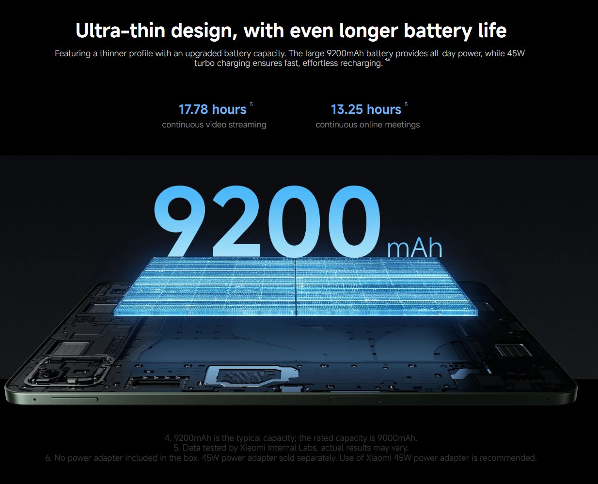 バッテリー容量は9200mAhと大容量!電池持ちも良好で、YouTubeなど動画ストリーミングにおいては最長17時間を超えるほど。急速充電は最大45Wに対応でここも高スペックです。