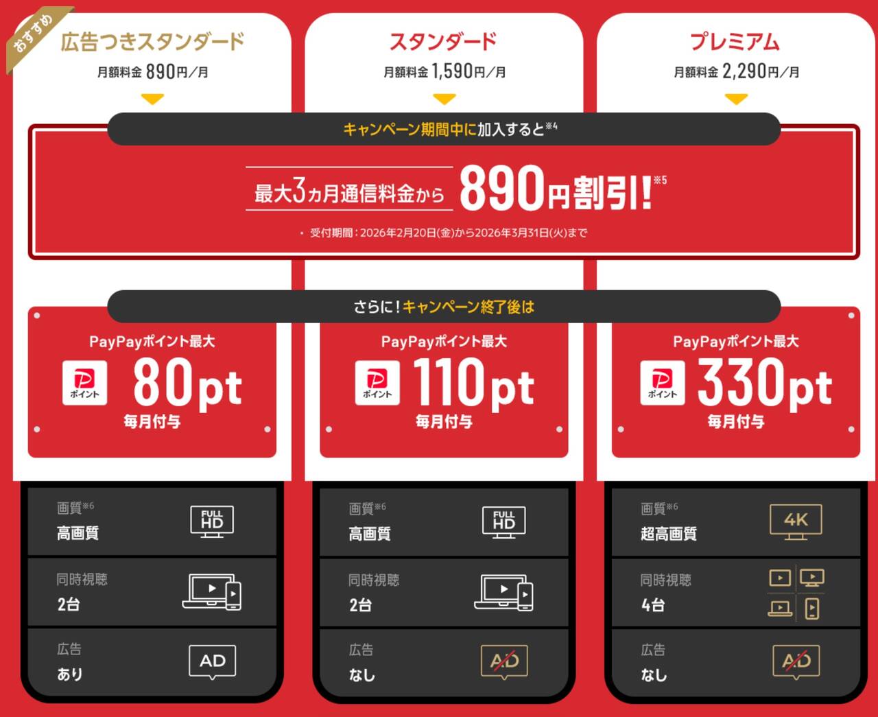 この890円という金額、Netflixの「広告付きスタンダードプラン(月額890円)」とピッタリ同額。つまり、3ヶ月間は実質無料でNetflixが楽しめてしまうというわけ。